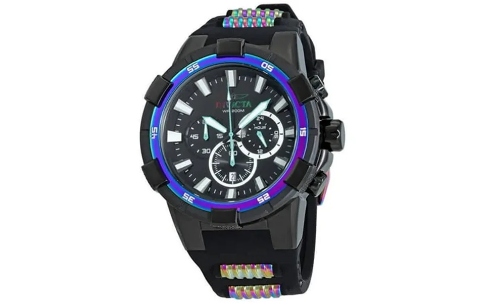 Black ion-plated stainless steel case with a black polyurethane strap with rainbow plated accentst. Fixed black ion-plated bezel. Black dial with luminous hands and index hour markers. Minute markers around the outer rim. Dial type: analog. Luminescent hands and markers. Date display at the 6 o clock position. Chronograph