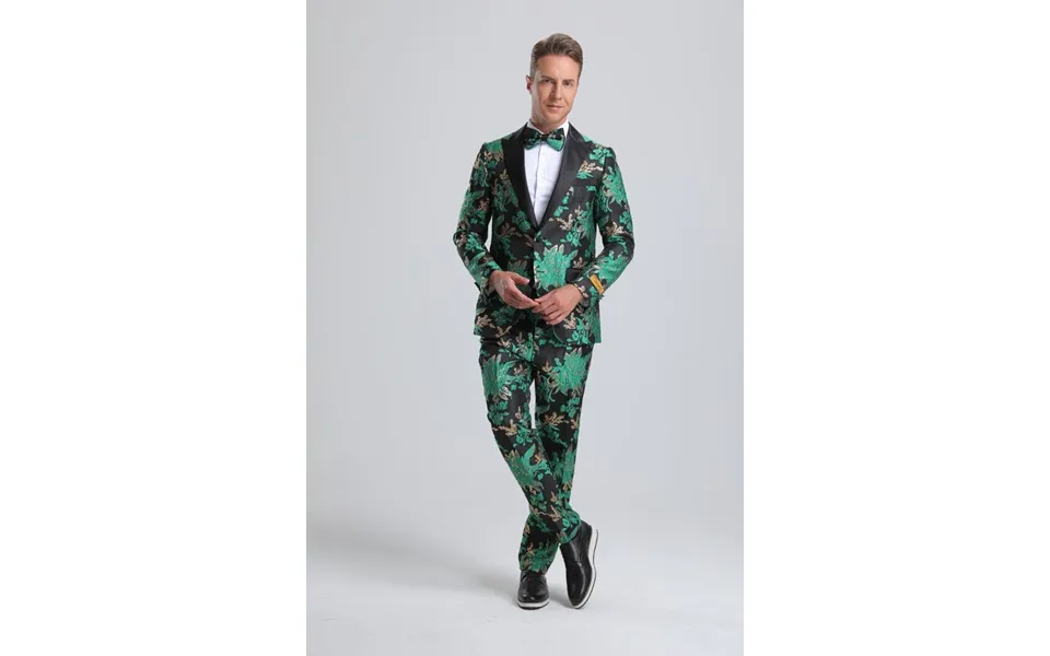2 Button. Peak lapel. Paisley or floral pattern. Single breasted. One chest pocket. Two flap front pockets