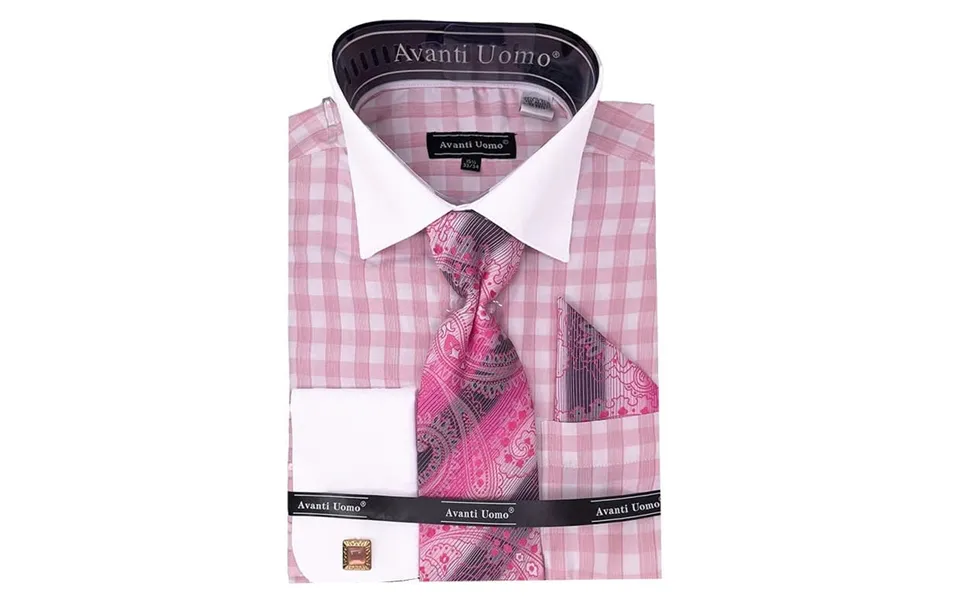 This dress shirt features a contrast color french cuff and collar in a cotton blended houndstooth pattern. It comes with the shirt, tie, and hankerchief.