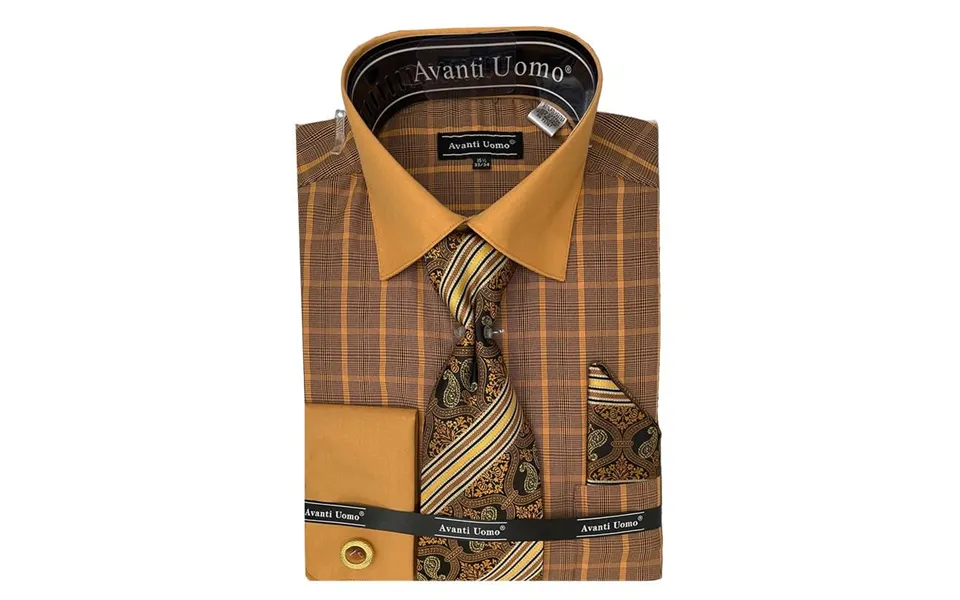 This dress shirt features a contrast color french cuff and collar in a cotton blended tonal check pattern. It comes with the shirt, tie, and...show more