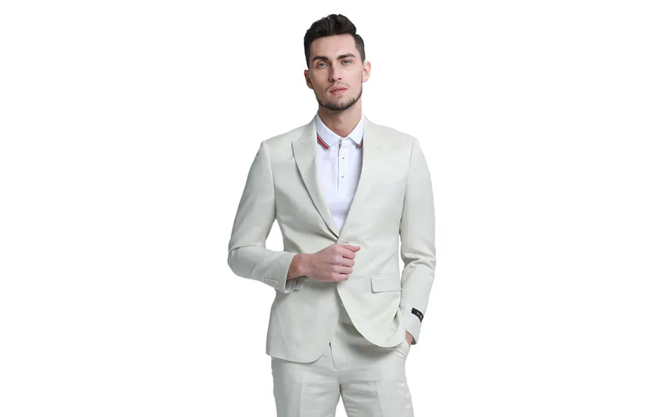 Jacket:. Single breasted for a sleek, polished look. Two button closure for a timeless silhouette. Peak lapel for a sophisticated touch. Side flap pockets for added convenience. Pants:. Skinny fit for a modern, stylish look. Solid for versatile pairing options. This classic men's suit is the perfect combination of style, comfort, and versatility. The single-breasted jacket features a two-button closure, peak lapel, and side flap pockets for a timeless silhouette. The skinny-fit pants are solid for effortless pairing options. Whether you're dressing up for a special occasion or need a go-to suit for the office, this timeless ensemble will have you looking sharp