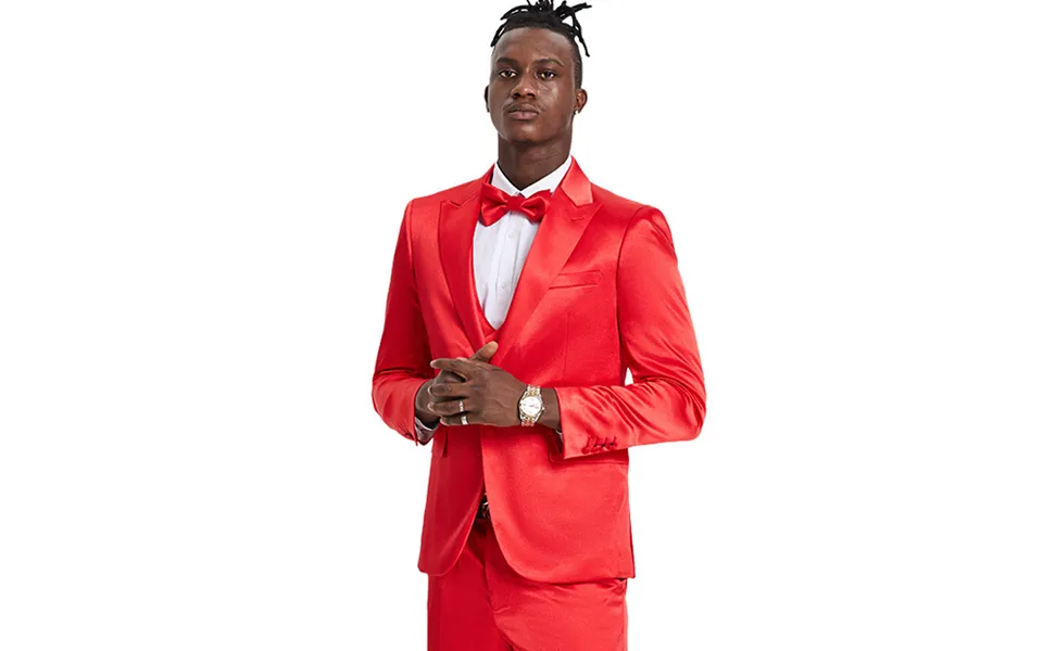 Jacket: sharkskin with peak lapel, one button closure, and side flap pockets.. Vest: collared vest with double breasted design and matching suit.. Pants: skinny fit with sharkskin fabric.. This men's suit set is the perfect combination of style, comfort, and versatility. The jacket is made of sharkskin fabric and features a peak lapel, one button closure, and side flap pockets. The accompanying vest is collared and double breasted with a matching suit. The pants are skinny fit with the same sharkskin fabric. This suit set is perfect for any formal occasion and can be dressed up or down for a timeless look.