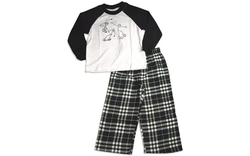 Wes and willy Boys long sleeve skateboard pajamas white black long sleeve baseball style top ribbed neck stick figure skateboarders graphic plaid pant full elastic...show more