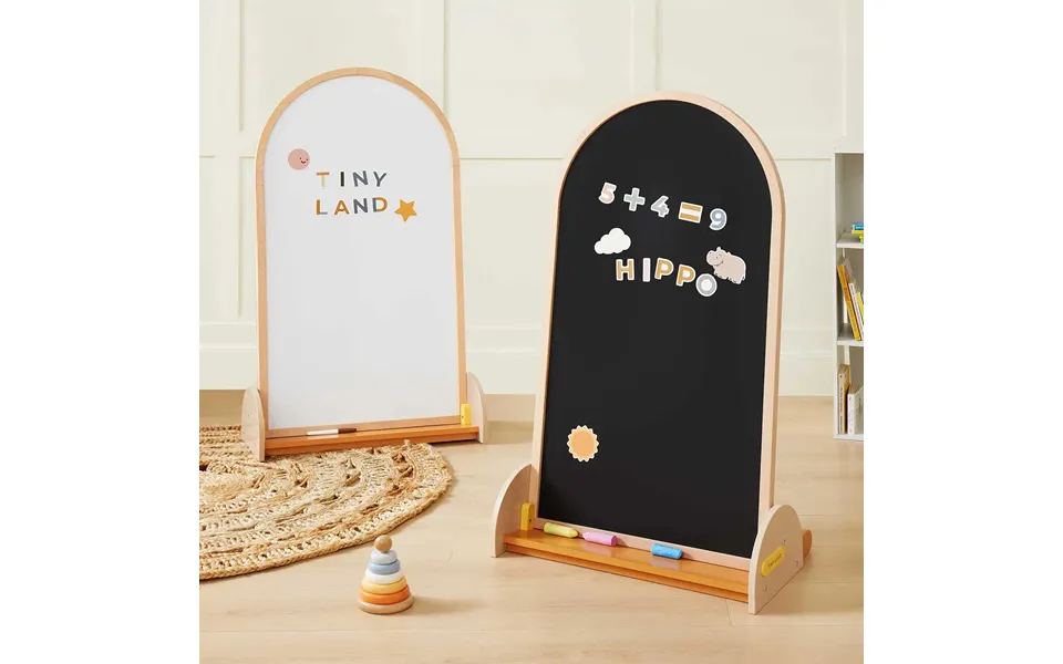 Premium beechwood frame & extra-large creative space made from smooth, splinter-free beechwood, this 22 × 40.5 Board gives kids plenty of room to doodle, write, and explore big ideas without running out of space. 2-In-1 double-sided magnetic fun one side is a chalkboard, the other a whiteboard both with magnetic panels to hold letters, numbers, and learning tools. The board detaches from the base for tabletop play, offering endless possibilities. Stable & safe triangular support featuring a sturdy base plus a fold-out support bar, this easel stays firmly in place during play. The support folds in for compact storage or wall placement without drilling. Smooth, long-lasting writing surface crafted with a dense mdf core for an even, durable surface that resists dents and keeps writing smooth far superior to hollow honeycomb boards. Magnetic learning accessories included comes with alphabet & number sets, plus weather, emotion, and animal magnets for interactive play and storytelling. Built-in angled storage shelf keeps chalk, markers, and erasers neatly organized and within easy reach.