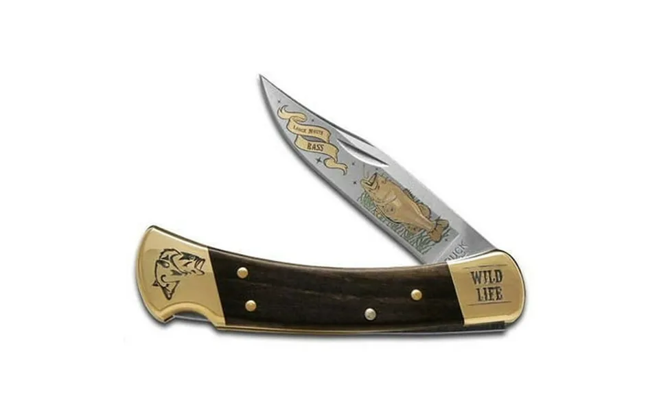 Wild life series large-mouth bass engraved bolsters this beautiful buck ebony wood folding hunter is handcrafted in the u.S.A. And comes with a limited lifetime manufacturer s warranty. New and never been used or re-sharpened this gorgeous knife is 4 7 8 inches long folded closed and weighs approximately 7.4 Ounces. This knife utilizes a 3 3 4 locking clip blade. The blade material is 420hc stainless steel with satin finish and etched with large-mouth bass wildlife scene. The handle is smooth ebony wood. The bolsters are bass engraved brass. This knife is presented with black leather belt sheath. If you are looking for a great knife to collect carry or give as a gift don t pass this one up note: custom knives are warrantied by the artist not by buck. Buck 110wls-bass folding hunter wo