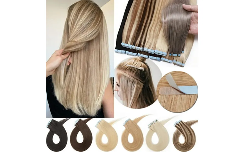 Blends with your own natural hair. Product details: 1.Material: 100% human hair 2.Length:12 14 16 18 20 22 24 3.Net weight:40g-20 pcs 2g pc 50g-20 pcs 2.5G pcs 4.Texture: straight thick from top to end. How to wear tape in hair extensions step 1- hair extensions must be applied to washed clean hair. Part your hair in desired area where extension needs to be applied. Step 2- rip off the cover on the tape extension to expose the super tape. Line up extension directly and attach by pressing to piece of desired hair. Step 3- double the thickness by adding another layer to the underneath of the piece. Step 4- two sticky sides face each other and the section of hair will be in the middle. Like a sandwich. Step 5- please note: once hair is in use your flat iron on a low heat setting. Please control the temperature within 350 degrees fahrenheit. Please don’t use too high temperature because that may cause the tape to melt.Then heating the tapes 5-6s one time repeating 5-6 times. You are finished your hair is now thick and seamless. How to remove tape in hair extensions step 1- use with a professional product for taking ou...