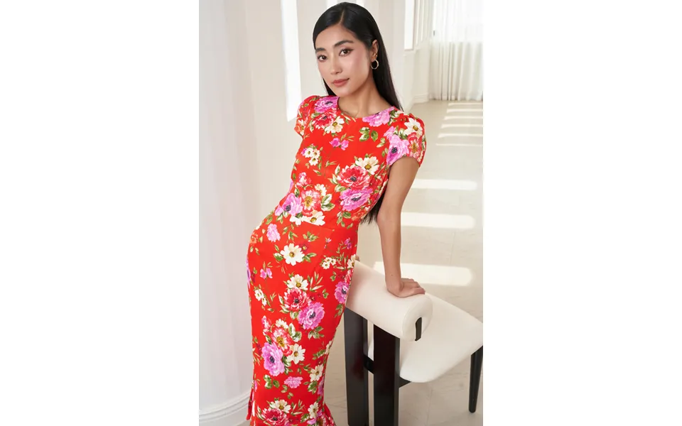 Final sale. Bright and bold, this red floral midi dress features short sleeves and a ruffle hem for a touch of charm. Effortlessly chic for...show more