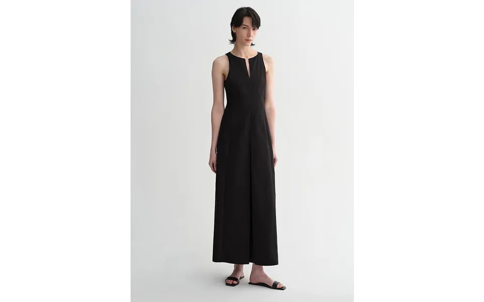 Design the vertical slit creates a v-neck shape, adding a sense of airiness and presenting an elegant and subtle style. The exquisite tailoring results in a refreshing sleeveless design that doesn't show armpit fat, making it look even more refreshing and elegant. There are hidden vertical side pockets on both sides of the skirt, keeping a clean visual effect while being practical and casual. *Model is 178cm tall and wears size l fabric high-quality micro-elastic cotton-polyester blend: high thread count, dense weave for flexibility and shape. Skin-friendly, smooth, and delicate. Soft yet structured cotton fibers ensure breathability and a gentle touch. Polyester adds wrinkle resistance, while spandex enhances elasticity for comfort and durability. Triple-fiber blend offers stretch, skin-friendliness, and easy care, creating a simple, elegant, and premium style.