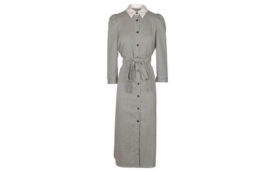 441035 White black Houndstooth shirt dress. Contrast collar. Long puff sleeves with slits at the bottom. Full-length front button closure. Sash to tie at the...show more