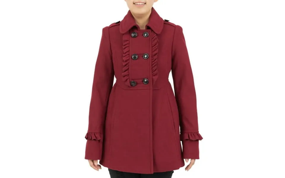Baby doll coat with front chest ruffles complimented with sleeve cuff ruffle details for a feminine touch. Front and back side panel seams.
