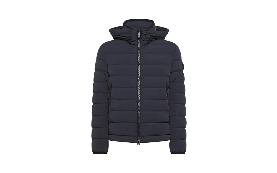 Stretch, down-proof nylon down jacket with semi-gloss surface. The elastic drawstrings, surrounding the fixed hood and the cuffs with inserted elastics, allow the model to...show more