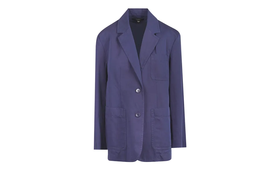 450466 Blue Linen and cotton blazer. Collo with regular revers. Long sleeves with buttons at the bottom. Applied pocket on the chest. Front pinces. Front...show more