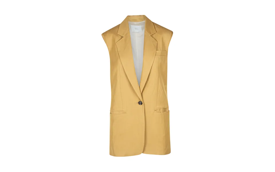 450489 Senape Gilet in misto lino. Collo con revers. Smanicato. Spalline imbottite. Taschina frontale a filetto sul petto. Pinces frontali. Chiusura frontale con bottone. Due...show more