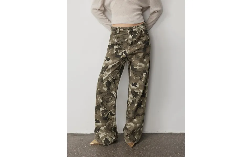 Design straight-leg jeans with draped splits to slim down the hips and are comfortable and not stuck in place vertical lines allow easy control of different leg types. Fabric 100% pure cotton yarn with high strength, enhanced weaving technique for even better warp and weft construction, resulting in a finer density. The fabric feels firm yet resilient, with a soft and delicate sheen. The surface naturally forms a subtle bamboo-textured pattern, giving the fabric a refined, three-dimensional clarity. The texture is strong, skin-friendly, and drapes smoothly, offering a structured fit that doesn’t cling to the body. Enzyme stone wash original camouflage print luxurious brand craftsmanship in denim washing, featuring an eco-friendly enzyme stone wash combined with original camouflage and rose prints. The color is soft and delicate with rich layering, not overly flat, perfectly balancing strength and softness. While exuding a cool and edgy vibe, it also showcases a unique personality.