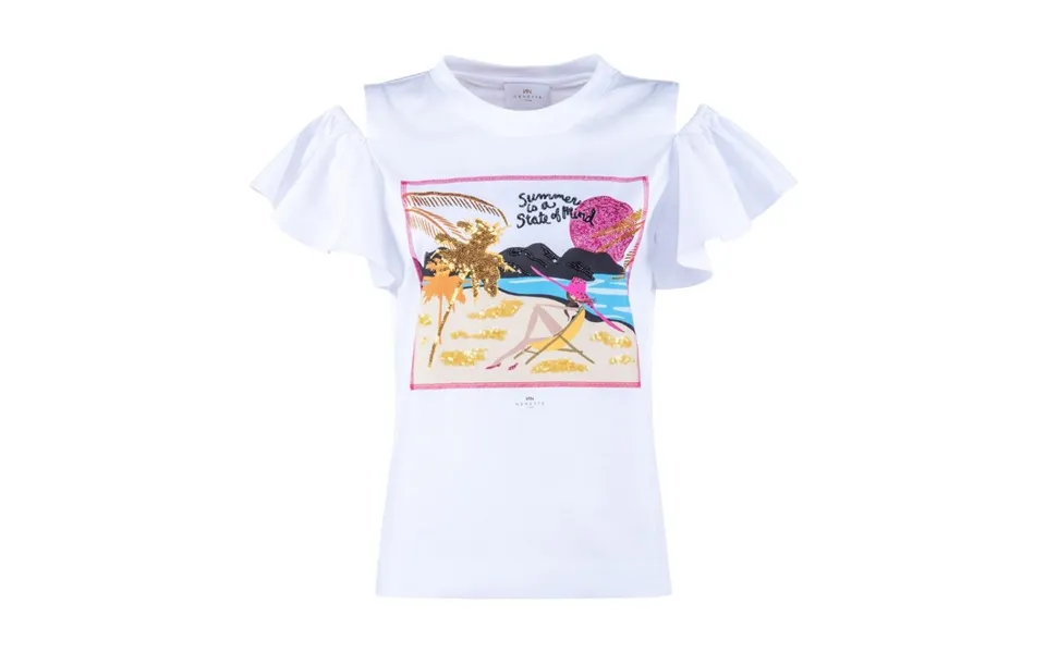 T-shirt off shouldersleeves with volantsilk insert with sunset print in rhinestones and sequinscomposition: 100% cottonendfragment
