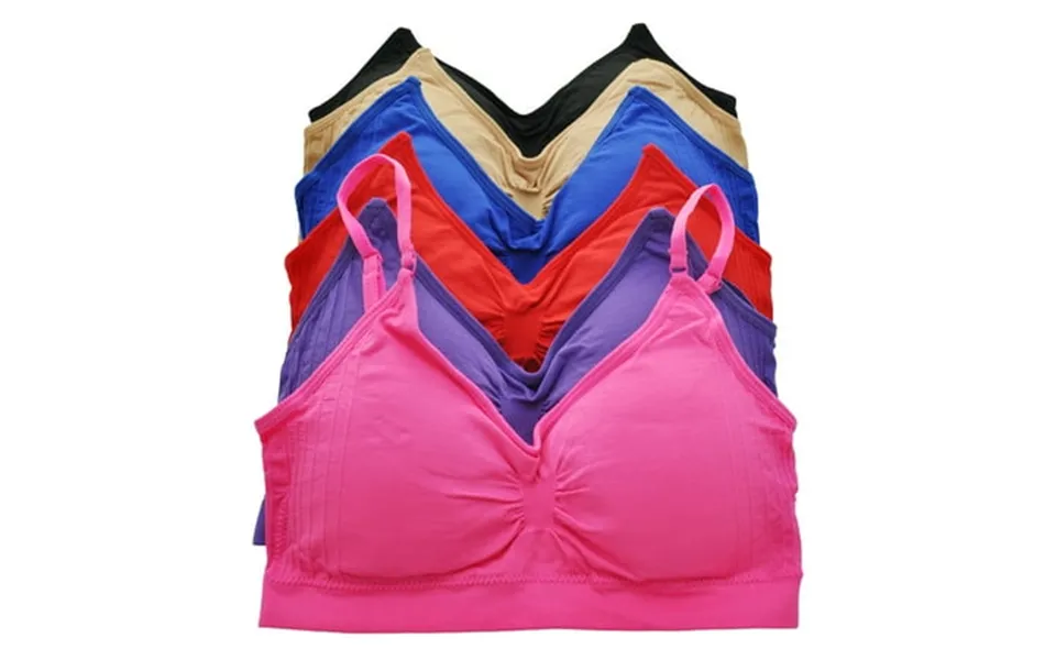 These seamless bralettes feature ruching in the front with removable padded cups. They are wireless and come with adjustable straps for additional support. Available in...show more