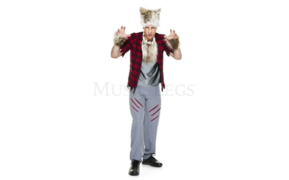 This costume includes silver top with built in torn hem checker print shirt and faux fur neckpiece slashed pants headpiece with faux teeth and wrist cuffs. It does not include shoes. Size* description small fits most men with chest size 34