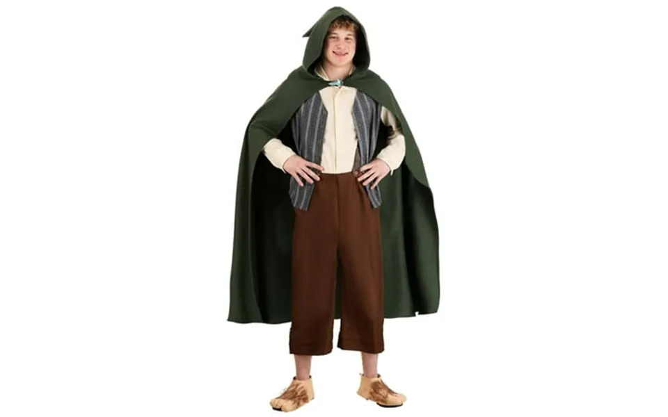 Adult samwise lord of the rings costume next stop mordor it s not as though you ever expected to leave hobbiton. You were perfectly happy living in your hobbit hole visiting your favorite tavern every night to spend time time with your friends and pine after the pretty barmaid. But then you overheard something very strange happening over at old bilbo baggins place and suddenly you re thrust into a quest bigger than anything you could ever imagine what would your old gaffer say about all of this product details be the hero who saves middle earth when you wear this officially licensed samwise lord of the rings men s costume do the gamgee family proud in this exclusive outfit. It includes a shirt with long sleeves that looks great under the blue and grey vest trimmed with decorative buttons. Brown pants that are comfortable enough for long treks and a green cloak that fastens at the throat with a pin the elves gave you finish the look. Just add the included hobbit shoe covers the eagles are coming after dealing with creepy slimy creatures who cough a lot and talk to themselves giant spiders orcs undead armies and an insane amount of lava you re a hardened adventurer you have plenty of stories to tell and you can take care of yourself pretty much anywhere. That s why your choice to come back and marry that pretty barmaid is just right for you you ve done everything you set out to do. Now you can go home. Congratulations you re fantastic at quests