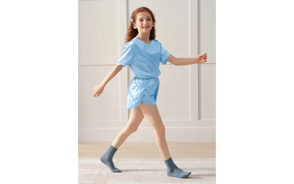 Step into a world of light dreams and delightful comfort with our girls pajama sets in airy blue. Perfect for the little fashionista, this set blends cozy charm with a refreshing touch of soft, sky-inspired color. Silky softness: our pajama sets are crafted from lightweight satin silk, delivering a smooth, gentle touch that pampers your little one's skin. Whether she's gearing up for a cozy night's sleep, a playful playdate, or a lively summer party, these pajamas ensure she stays comfortable and stylish. Charming design: explore our exclusive designs featuring a spectrum of unique colors that make every moment memorable. The lovely pink hue adds a touch of sweetness to her nighttime routine, making her feel like she's floating on a cloud of dreams. Comfortable fit: our girls' shorts have premium-quality rubber waistbands, offering just the right amount of elasticity for a snug and comfy fit. Say goodbye to restless nights and hello to uninterrupted slumber. Ideal gift choice: suitable for girls aged 6 to 14, these pajama sets are perfect for any special occasion. Whether it's a birthday celebration, a cozy night at home, or a special role as a flower girl, our satin silk sets will surely bring a smile to her face. Perfect for 10-year-old birthday gifts and beyond, they add a touch of elegance to every moment. Wrap your little one in the soft embrace of our girls pajama sets in pink. It's more than just sleepwear it's a dreamy escape to comfort and style