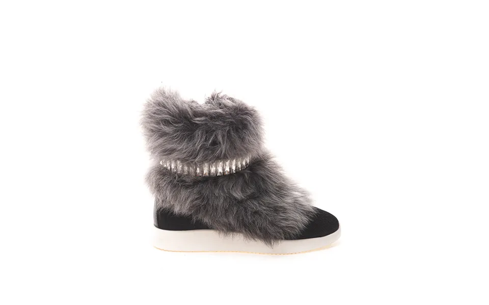 Sneaker nera con pelliccia e cristalli giuseppe zanotti. A punta tonda, tessuto tecnico suede nero, suola in gomma bianca a contrasto. Ricoperta da pelliccia eco...show more